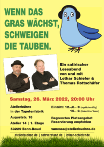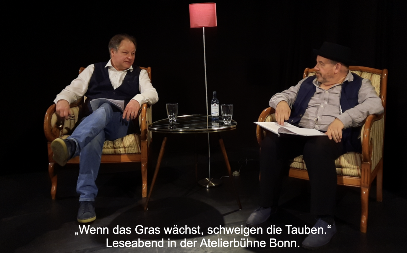 Über den Titel unseres gemeinsamen Leseabends im Kunstatelier Bonn-Beuel denken Lothar Schiefer und ich immer noch nach. Geplant hatten wir für März 2020. Dann kam der kleine Covid (19). Mit zwei Jahren Pandemie-Verzug hat´s dann im März 2022 endlich geklappt.